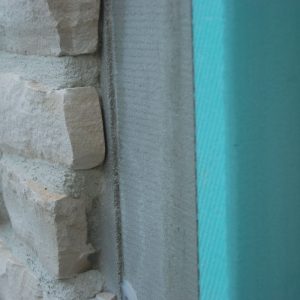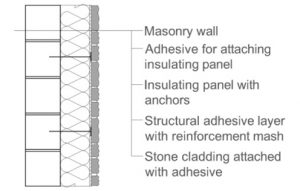 Sistem, ki ga želimo predstaviti je ETICS fasadni sistem s kamnito oblogo. Gre za podoben princip kot pri klasičnem sistemu z ometano fasado. Sistem sestavljajo toplotna izolacija v poljubni debelini, nosilna armirana plast, sidra, in lepljena kamnita obloga.Termo izolacija je iz ekstrudiranega polistirena (XPS), ki je zaradi svoje trdnosti posebej primeren za obremenitve, ki jih mora konstrukcijski sistem prenašati na nosilni zid. Izolacijo se na nosilni zid nanaša z za to namenjenim lepilom. Pri izvedbi ETICS sistemov s termo izolacijo iz polistirenov se je potrebno zavedati, da so ti posebej občutljivi na temperaturna nihanja. Nosilna armirana podlaga skrbi za »umiritev« površine na katero se nato lepi kamnita obloga. Armirana podlaga se izvede iz cementnega mikroarmiranega lepila, v dveh slojih. V prvi sloj se vtisne polipropilenska armaturna mreža. Skozi trden prvi sloj se uvrta kovinska fasadna sidra ter se nato glave sider prekrije z drugim slojem lepila. Tako izvedena podlaga je ključnega pomena za nadaljnje stabilno polaganje kamnite obloge. Pri izbiri lepil za lepljenje obloge je potrebno upoštevati priporočila v prejšnjem poglavju.Vertikalna obtežba teže kamnite obloge in horizontalna obtežba vetra in potresa, se na nosilni zid prenaša preko nateznih napetosti v fasadnih sidrih in tlačnih ter strižnih napetosti v toplotni izolaciji. Celotna nosilnost sistema je dejansko načrtovana tako, da se zagotovi predvidena življenjska doba fasade. Pri tem je treba nujno poudariti pomen pravilne izvedbe, ki je ključna za obstojnost sistema.