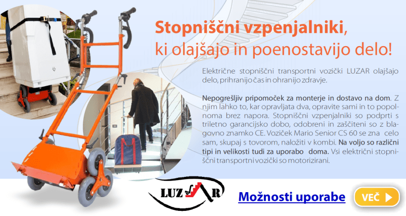 Električni stopniščni transportni vozički LUZAR olajšajo delo, prihranijo čas in ohranijo zdravje. Na voljo so različni tipi in velikosti tako za poslovno, kot domačo rabo (manjše izvedbe). Na voljo so različni tipi in velikosti. Voziček Mario Senior CS 60 se zna celo sam, skupaj s tovorom, naložiti v kombi. Je najboljši v kategoriji. Želite še več? Vas zanima kaj vse zmorejo? Za električne transportne vozičke za poslovno rabo nudijo tudi brezplačen preizkus delovanja neposredno v vašem podjetju.