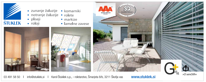 O trendih, opcijah montaže in upravljanju zunanjih senčil smo govorili s podjetjem Štuklek. Ob obisku njihove proizvodnje so nas seznanili, da imajo povsem lastno proizvodnjo lame, kar jim omogoča zagotavljanje kakovosti, ob enem pa na trg lahko ponudijo tudi ugodno ceno zunanjih žaluzij. Naročniki se danes najpogosteje odločajo za široke aluminijaste zunanje žaluzije.  Najpogosteje v izvedbi s podometnimi omaricami. Sistem upravljanja žaluzij je možen ročno ali z motornim pogonom. Priporočajo vgradnjo z motornim pogonom, saj le ta nudi veliko udobje pri upravljanju s senčili. Pravijo pa, da se naročniki danes zelo pogosto odločajo za kombiniran sistem. Žaluzije, ki senčijo stekleno steno v dnevni sobi pogosto opremljamo z motornim pogonom, druge steklene površine objekta, pa z ročnim upravljanjem. Pri izbiri zunanjih senčil bodite zelo pozorni na kakovost. Zunanje žaluzije Štuklek so večstopenjsko lakirane in so zato zelo odporne proti vremenskim vplivom in UV-žarkom, robovi so zaobljeni, kar jim zagotavlja čvrstost in stabilnost in ne nazadnje tudi lepši videz.
