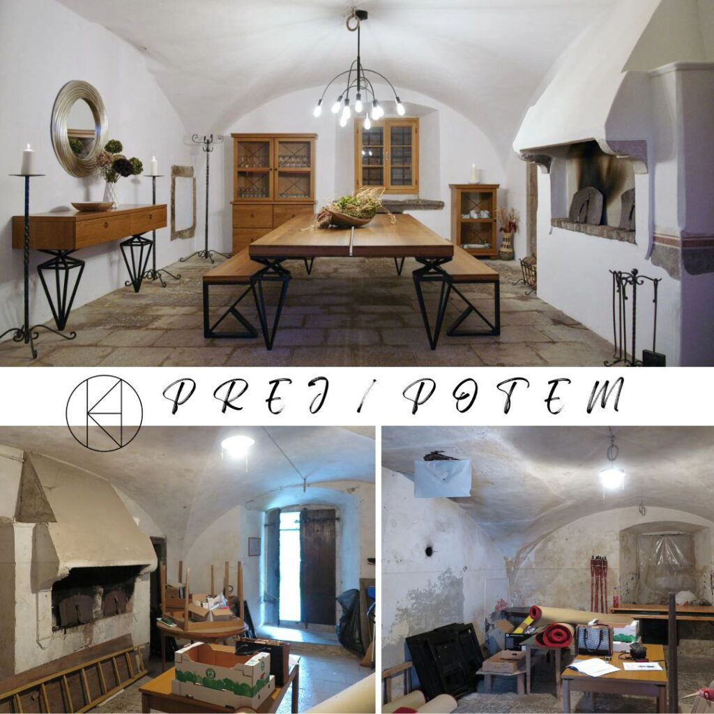 Potem: Po prenovi prostor zasije v novi luči. Ohranjen kamnit tlak in kamnito korito pod oknom, z svežim apnenim opleskom je obogaten s sodobnim pohištvom. Masivnim, a hkrati lebdečim. Kombinacija svetlih tonov sten, toplega lesa in železnih dodatkov ustvarja prijetno vzdušje, ki obiskovalcem ponuja udobje v historičnem okolju.