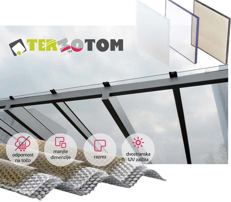 V poletnih mesecih toča povzroča ogromno škodo tudi na zasebni lastnini. Ker se tega vremenskega pojava ne da z gotovostjo napovedati, je preventiva najboljša obramba. Avtomobile in lastnino na terasah zaščitite s prosojnimi polikarbonatnimi kritinami odpornimi na točo. Polikarbonatno steklo je zelo žilavo in varuje naše premoženje, hkrati pa prepušča velik del naravne svetobe, ki pa je izjemno pomembna za človekovo počutje in zdravje. Uredite si vašo teraso v prijeten kotiček. Kot posebno rešitev predstavljamo Solar control plošče saj zagotavljajo udobnejše bivanje, saj zaustavijo več kot 50% IR žarkov. Zaradi tega je pod njimi nižja tudi temperatura, bivanje pa postane udobnejše ter prijetnejše. Pri Termotomu vam nudijo kvalitetne kritine, s standardno dvostransko UV zaščito, ki zagotavlja dolgo življenjsko dobo in ves potreben pritrdilni material. Poleg tega pa lahko med ponudbo najdete tudi atermične, solar control večslojne polikarbonatne plošče v sivi barvi. Še več konkretnih rešitev in idej ter kontakt za naročilo najdete TUKAJ (KLIK).