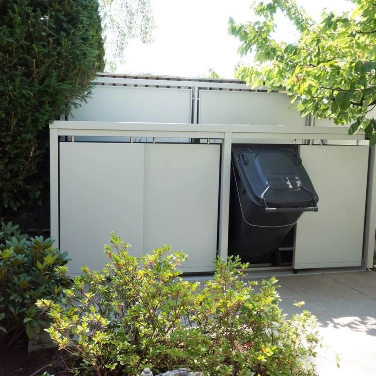 Moderni smetarniki StyleOUT® skrijejo zabojnike pred pogledi, zaščitijo jih pred vremenskimi vplivi in hkrati polepšajo okolico doma. Izdelani so iz trpežnega aluminija, na voljo v različnih dimenzijah in barvah, z možnostjo zasadljive strehe ter nagibnim sistemom za enostavno uporabo.