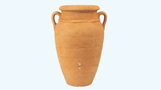 Dekorativni zbiralnik deževnice Amfora v antičnem slogu z vgrajeno posodo za rože. Na voljo v velikostih 200 L, 360 L in 600 L ter barvah peščena in terrakotta. UV odporen, vremensko obstojen in estetska rešitev za vsak vrt.